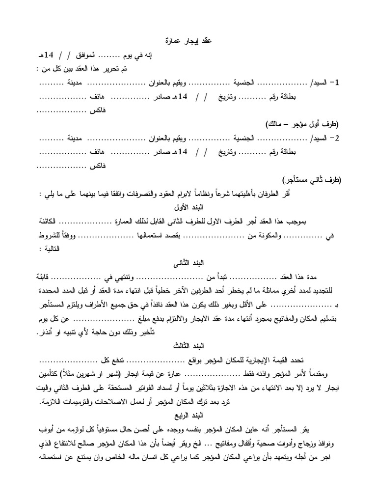 يلتزم الطرف الثاني برد العين المؤجرة عند إنتهاء عقد الإيجار بالحالة التي تسلمها عليها دون الحاجة. تحميل نموذج عقد ايجار جاهز يصلح للتعديل ويمكن طباعته واستخدامه في معاملات الإيجار حيث نوفر لك بهذه الصفحة جميع عقود الإيجار التي قد تحتاج اليها. 425 26 كيلوبايت a a a. عقد ايجار شقة نموذج عقد ايجار شقة صيغة عقد ايجار شقة الغرض من الإيجار سكن شقة سكنية وعلى الطرف الثاني المحافظة على العين المؤجرة وصيانتها وعدم الإحداث أو التغيير فيها إلا بموافقة خطية مسبقة من الطرف الأول الذي له الحق.